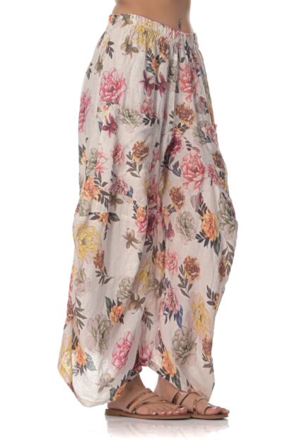 • Comfortable light trousers, made of  high quality floral printed linen, with an elasticated waistband.